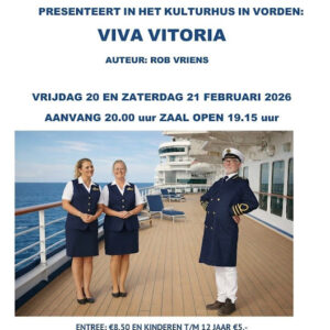 De Kranenburgse toneelvereniging Krato brengt op vrijdag 20 en zaterdag 21 februari in de grote zaal van het Kulturhus het komische toneelstuk "Viva Vitoria' ten tonele. De voorstelling speelt zich af op een luxe cruiseschip met enkele gastvrouwen die niet zo vriendelijk blijken te zijn en allerlei bijzondere mensen aan boord. Op een gegeven moment verdwijnen er spullen en dat leidt tot een heel aparte sfeer op het schip. Het wordt een cruise vol komische momenten. Bezoekers kunnen dankzij de creatieve decorgroep van Krato meekijken in de stuurhut van het schip én het zonnedek. Krato repeteert het toneelstuk al sinds afgelopen oktober; sinds twee weken in de grote zaal het Kulturhus. De 13 toneelspelers van Krato brengen het verhaal van ‘Viva Vitoria’ tot leven met bijzondere personages, verrassende wendingen en de nodige dosis humor. Met dit jaar Herbert Rutgers weer in hun midden. De geboren en getogen Kranenburger stond 15 jaar geleden voor het laatst voor Krato op de toneelplanken. Naast Herbert Rutgers bestaat de spelersgroep dit jaar uit Herbert Hulstijn, Anita Pierik, Martine ten Arve, Marjan Buunk, Miranda Beekman, Mirjam Harmsen, Tiny Berends, Richard Ooms, Bernardet Wunderink, Sander Roelvink, Berno Duistermaat en Jan Groot Jebbink. Souffleuse is Anneke Roelvink en de grime wordt verzorgd door Marlies Meenks, Ingrid Ooms en Anneke Harmsen. De decorgroep bestaat uit Marcel Dekkers, Berno Duistermaat, Tonny Lubbers en Anneke Harmsen en het geluid wordt verzorgd door Herman Bolink. Filmpjes Op de facebookpagina van Krato wordt op originele wijze een voorschot genomen op de voorstellingen. Wekelijks laat de toneelvereniiging een kort filmpje zien van één van de acteurs. Toegangskaarten Toegangskaarten voor de voorstellingen van ‘Viva Vitoria’ op vrijdag 20 en zaterdag 21 februari zijn vanaf 1 februari uitsluitend in de voorverkoop verkrijgbaar bij Bloemsierkunst Halfman en het Kulturhus in Vorden en kosten 8,50 euro voor volwassenen en 5 euro voor kinderen tot en met 12 jaar. Op beide avonden begint de voorstelling om 20.00 uur, de zaal is open vanaf 19.15 uur.