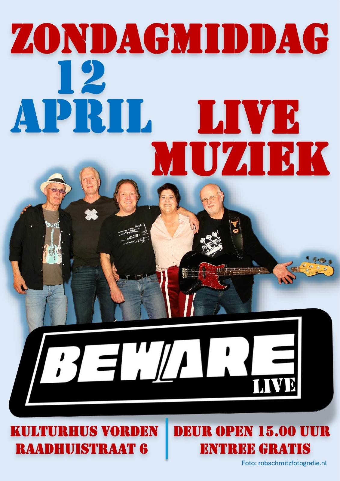 Op zondag 12 april speelt de band Beware in de ontmoetingsruimte van het Kulturhus. De toegang is gratis. Aanvang: 15.00 uur.